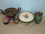 Ceramic signed Covered Bowl, Cloisonne Vase, modern metal urn, asian mini ginger jar, two signed small pottery vases. Ceramic signed Covered Bowl, Cloisonne Vase, modern metal urn, asian mini ginger jar, two signed small pottery vases.
