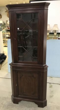 Virginia Galleries Henkel Harris Corner Cabinet, Chippendale style, genuine mahogany, glass top door with two shelves, bottom door, has keys, lighted, good condition, 76"h., 28 1/2"w., 16"d. Virginia Galleries Henkel Harris Corner Cabinet, Chippendale style, genuine mahogany, glass top door with two shelves, bottom door, has keys, lighted, good condition, 76"h., 28 1/2"w., 16"d.