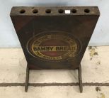 Bamby Bread Advertisement Broom Stand, tin and wood, vintage, has age wear, 29"h., 18"w. Bamby Bread Advertisement Broom Stand, tin and wood, vintage, has age wear, 29"h., 18"w.