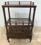 Antique Mahogany Canterbury Sheet Music Stand, ornate carved section, single drawers, on casters, brass gallery, 36"h., 24". ,15"d. Antique Mahogany Canterbury Sheet Music Stand, ornate carved section, single drawers, on casters, brass gallery, 36"h., 24". ,15"d.