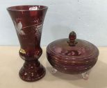 Bohemian Crystal Ruby Red Cut to Clear Vase 8"h., 4"dia. and Covered Candy Dish, footed, 4"h., 6 1/2"dia. Bohemian Crystal Ruby Red Cut to Clear Vase 8"h., 4"dia. and Covered Candy Dish, footed, 4"h., 6 1/2"dia.