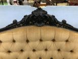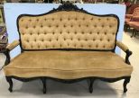 Beautiful French Style Black Lacquer Settee, carved crest and designs painted with gold gilt, button tufted upholsterd back, seat has some light dirt spots, back has upholster wall bump, 71"long., 50"h. Beautiful French Style Black Lacquer Settee, carved crest and designs painted with gold gilt, button tufted upholsterd back, seat has some light dirt spots, back has upholster wall bump, 71"long., 50"h.