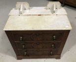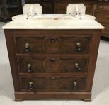 Antique Victorian Style Walnut Washstand, marble top, three drawers, candle stands, back marble piece needs screws, 29"h., 30"w., 18"d. Antique Victorian Style Walnut Washstand, marble top, three drawers, candle stands, back marble piece needs screws, 29"h., 30"w., 18"d.