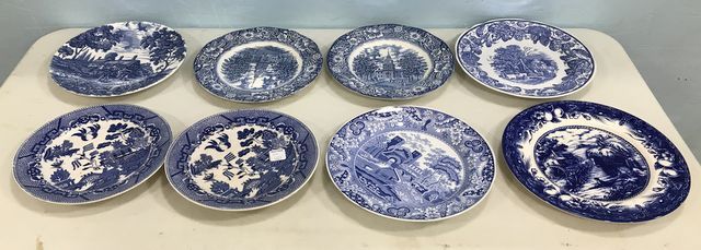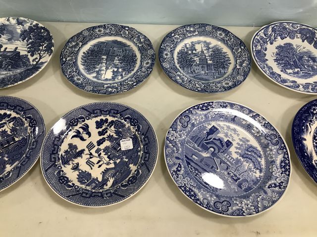 Eight Blue and White Collectibles Plates, Shakespeare country ironstone, Liberty Blue, Royal Stafford, Spode Blue room, Japanese. Eight Blue and White Collectibles Plates, Shakespeare country ironstone, Liberty Blue, Royal Stafford, Spode Blue room, Japanese.