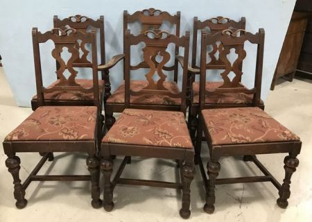 Six Vintage Depression Era Dining Chairs, five sides, one arm, walnut, have finish wear. Six Vintage Depression Era Dining Chairs, five sides, one arm, walnut, have finish wear.