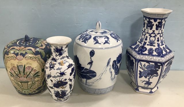 Four Modern Chinese Porcelain Pottery, Chinese vase 15"h., Ginger jars, small vase 10"h. Four Modern Chinese Porcelain Pottery, Chinese vase 15"h., Ginger jars, small vase 10"h.