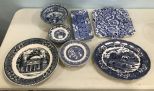 Group of Blue and White Pottery, Staffordshire platter, Myott Meakin plates, Royal Wessex, square plate, tray, and bowl. Group of Blue and White Pottery, Staffordshire platter, Myott Meakin plates, Royal Wessex, square plate, tray, and bowl.