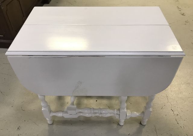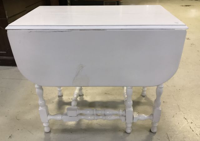White painted gate leg table, drop leaf, no leaves, 29"h., 35"w. White painted gate leg table, drop leaf, no leaves, 29"h., 35"w.