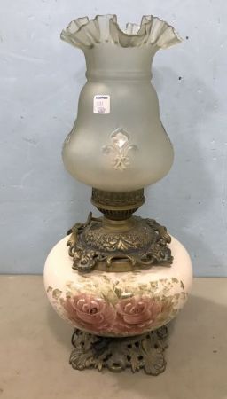 Vintage Hand Painted Flower Globe Lamp, frosted glass shade, ornate brass frame, 23"h. Vintage Hand Painted Flower Globe Lamp, frosted glass shade, ornate brass frame, 23"h.