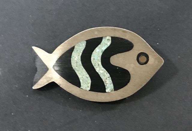 Fish Pin Marked Sterling .925 Mexico, artist's initials, CIN Or CNW, onyx and turquoise, 1 3/4". Fish Pin Marked Sterling .925 Mexico, artist's initials, CIN Or CNW, onyx and turquoise, 1 3/4".