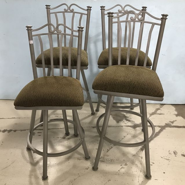 Four modern metal swivel bar stools, three matching 29"h seat to ground, one is 25"h to ground. Four modern metal swivel bar stools, three matching 29"h seat to ground, one is 25"h to ground.
