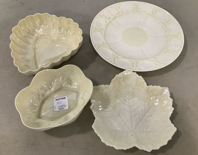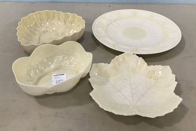 Belleek Eggshell Dishes, China, 4 total, plate 8"dia., heart dish, leaf dish, bowl. Belleek Eggshell Dishes, China, 4 total, plate 8"dia., heart dish, leaf dish, bowl.