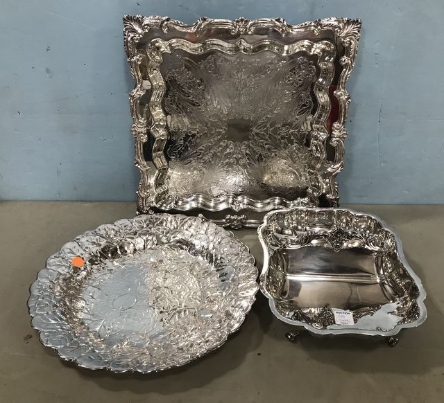 English Silver Square Tray, footed, Reed & Barton round dish, footed divided serving dish. English Silver Square Tray, footed, Reed & Barton round dish, footed divided serving dish.