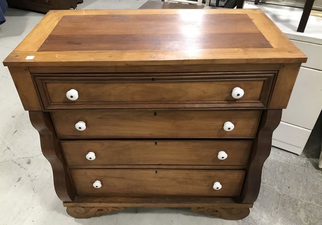 Antique Empire Style Natural Mahogany Chest of Drawers, four drawers, white porcelain knobs, light wear, 43"h., 42"w., 21"d. Antique Empire Style Natural Mahogany Chest of Drawers, four drawers, white porcelain knobs, light wear, 43"h., 42"w., 21"d.