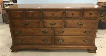Ethan Allen Maple Early American Style Dresser, 12 drawers, has finish wear, exposed to mildew, also included the matching pediment mirror, 35"h., 66"w., 21"d. Ethan Allen Maple Early American Style Dresser, 12 drawers, has finish wear, exposed to mildew, also included the matching pediment mirror, 35"h., 66"w., 21"d.