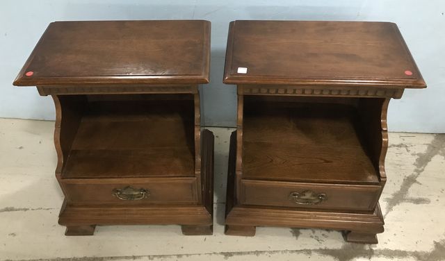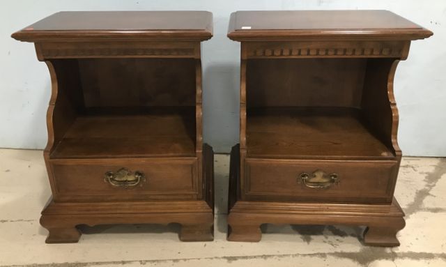 Pair of Ethan Allen Early American Style Night Stands, open front storage, single drawers, exposed to mildew, 26"h., 21"w., 13"d. Pair of Ethan Allen Early American Style Night Stands, open front storage, single drawers, exposed to mildew, 26"h., 21"w., 13"d.