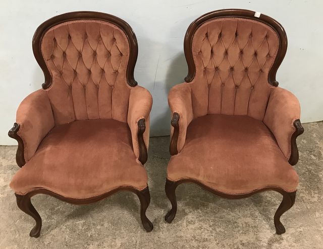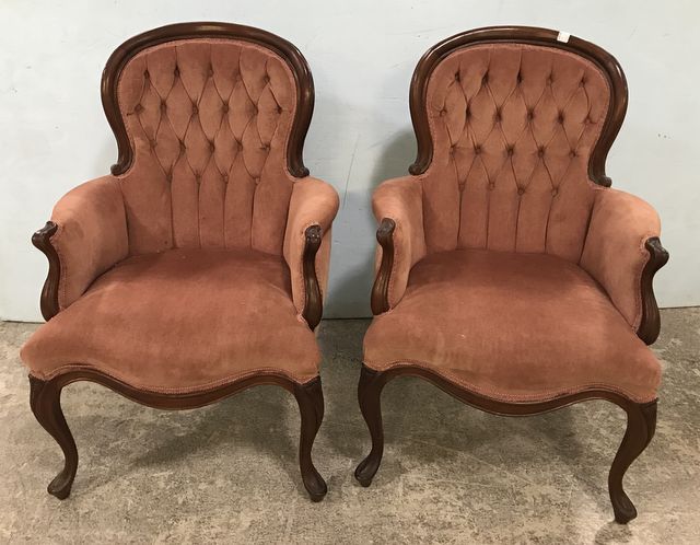 Pair of French Style Walnut Arm Chairs, button tufted, good condition, 36"h. Pair of French Style Walnut Arm Chairs, button tufted, good condition, 36"h.
