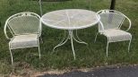 Outdoor White Patio Table and Two Chairs, round patio table, with two arm chairs, diamond pattern, used condition. Outdoor White Patio Table and Two Chairs, round patio table, with two arm chairs, diamond pattern, used condition.