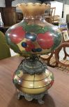 Vintage Hand Painted Fruit Pattern Globe Lamp, two piece, brass frame, has hurricane shade, 25"h. Vintage Hand Painted Fruit Pattern Globe Lamp, two piece, brass frame, has hurricane shade, 25"h.