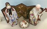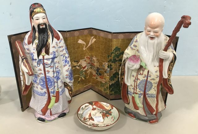 Two Asian porcelain men statues, hand painted, made in Taiwan, 12"h, mini oriental style screen, porcelain hand painted dish with mark. Two Asian porcelain men statues, hand painted, made in Taiwan, 12"h, mini oriental style screen, porcelain hand painted dish with mark.