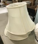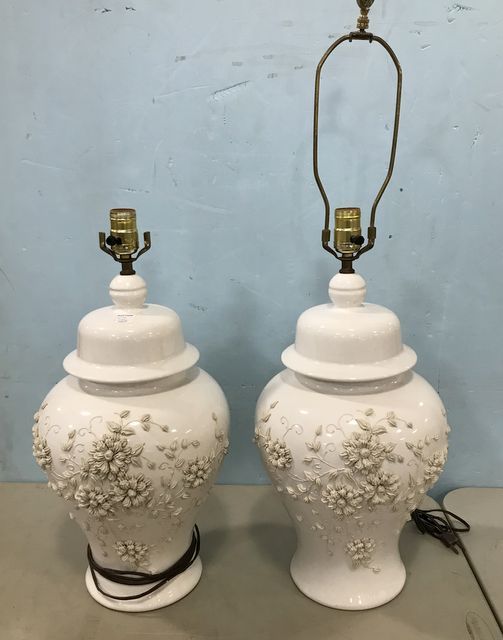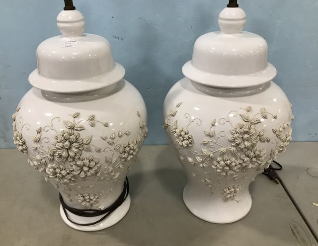 Pair of White Ceramic urn lamps, floral embossed artwork, has shades, 32"h. Pair of White Ceramic urn lamps, floral embossed artwork, has shades, 32"h.