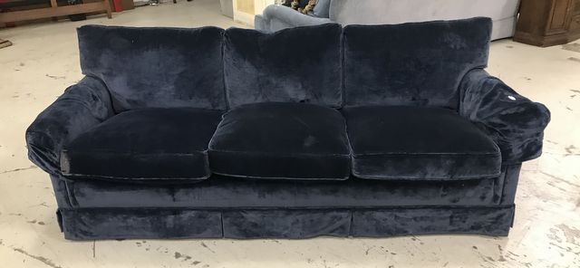 Three Cushion Navy Upholstered Sofa, suede style, arm covers, good condition, 7' long. Three Cushion Navy Upholstered Sofa, suede style, arm covers, good condition, 7' long.