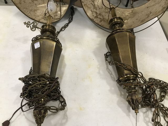 Pair of Brass Hanging Lamp Fixtures, with hanging chain, need new shades, lamps are 30"h. Pair of Brass Hanging Lamp Fixtures, with hanging chain, need new shades, lamps are 30"h.
