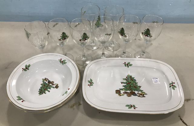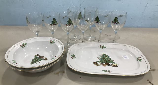 Holiday Hostess China Set, two serving bowls, platter, 8 Christmas wine glasses. Holiday Hostess China Set, two serving bowls, platter, 8 Christmas wine glasses.