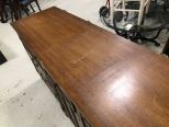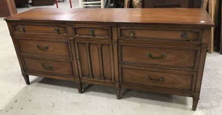 French Provincial Triple Dresser, included two back mirrors, 7 drawers, single door, has finish wear, exposed to mildew, 32"h., 75"w., 20"d. French Provincial Triple Dresser, included two back mirrors, 7 drawers, single door, has finish wear, exposed to mildew, 32"h., 75"w., 20"d.