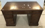 Davis Cabinet company knee hole desk, 6 drawers, cherry, top has wear and paper stuck on it, 30"h., 50"w., 26"d. Davis Cabinet company knee hole desk, 6 drawers, cherry, top has wear and paper stuck on it, 30"h., 50"w., 26"d.