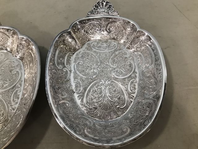 Two Ornate English Dishes, ornate engraved designs, 11"w. Two Ornate English Dishes, ornate engraved designs, 11"w.