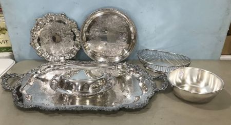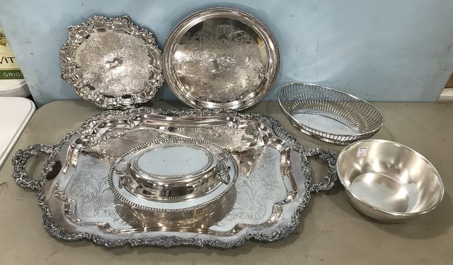 Large Silver Plate handled serving tray, large ladle, two bowls, round chargers, wire basket. Large Silver Plate handled serving tray, large ladle, two bowls, round chargers, wire basket.
