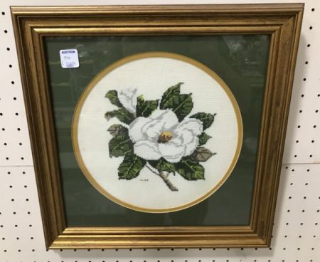 Cross Stitch Magnolia Signed HL, 99, oval matted, frame is 15"h., 15"w. Cross Stitch Magnolia Signed HL, 99, oval matted, frame is 15"h., 15"w.