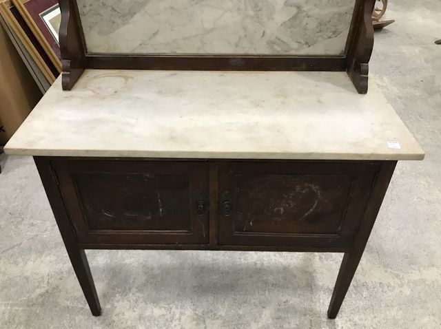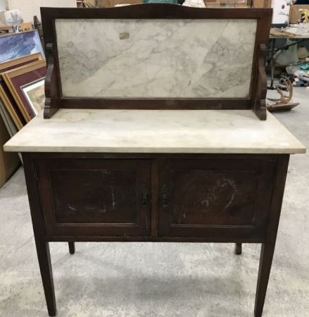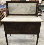 Antique Mahogany Marble Top Wash Stand, two piece marble with marble back splash, two doors, has finish wear, 45"h., 36"w., 15"d. Antique Mahogany Marble Top Wash Stand, two piece marble with marble back splash, two doors, has finish wear, 45"h., 36"w., 15"d.