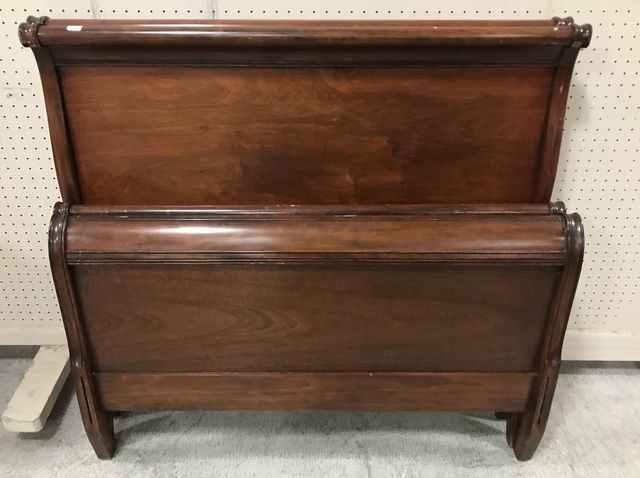 Pair of Mahogany Duncan Phyfe Twin Beds, mini sleight, wood rails, has finish scratches. Pair of Mahogany Duncan Phyfe Twin Beds, mini sleight, wood rails, has finish scratches.
