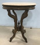 Victorian Style Marble Top Parlor Side Table, has finish wear, white oval marble, exposed to mildew, 27"h., 22"w. Victorian Style Marble Top Parlor Side Table, has finish wear, white oval marble, exposed to mildew, 27"h., 22"w.
