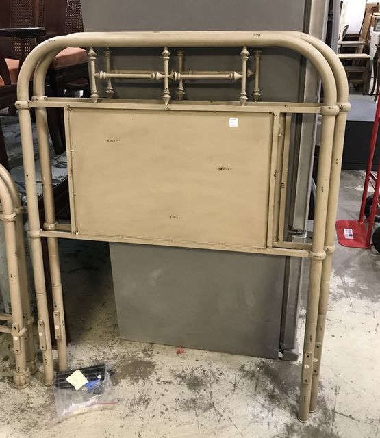 Pair of Painted Metal Twin beds, distressed, metal rails. Pair of Painted Metal Twin beds, distressed, metal rails.