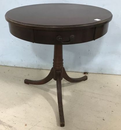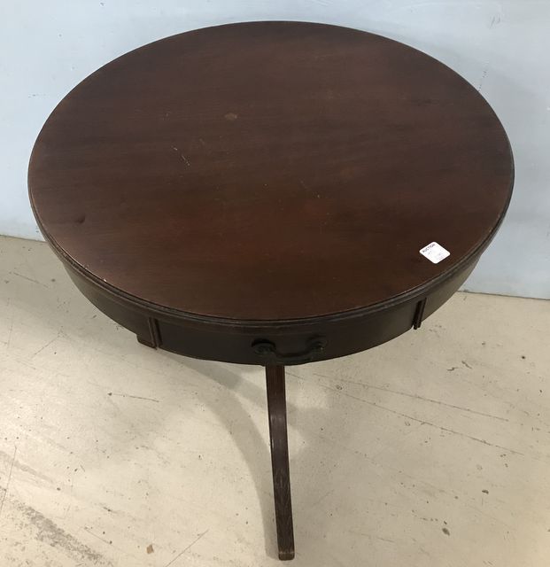 Mahogany Round Drum table, pedestal three leg, exposed to mildew, 26"h., 26"dia. Mahogany Round Drum table, pedestal three leg, exposed to mildew, 26"h., 26"dia.