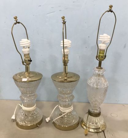Three Pressed Glass Vase Lamps, with brass frames, no shades, 29"h., Three Pressed Glass Vase Lamps, with brass frames, no shades, 29"h.,