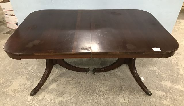 1920's Colonial Revival Walnut Dining Table, double pedestal, on casters, has finish wear, two leaves. 1920's Colonial Revival Walnut Dining Table, double pedestal, on casters, has finish wear, two leaves.