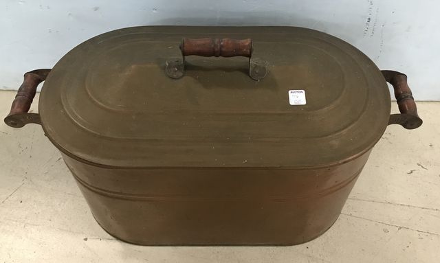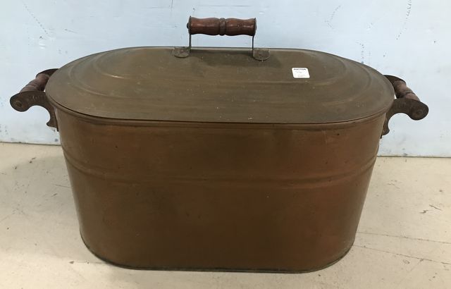 Rome copper bucket, wood handled, with lid, 12"h., 28"w. Rome copper bucket, wood handled, with lid, 12"h., 28"w.