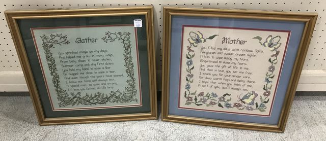 Mother and Father Framed Needle Points, 18" x 18". Mother and Father Framed Needle Points, 18" x 18".