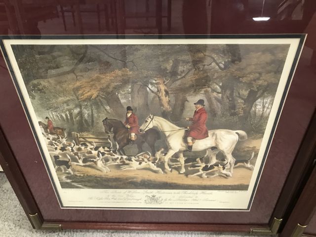 Pair of English Hunt Scene Prints, framed, printed by R. Davis, 21"h., 23"w. Pair of English Hunt Scene Prints, framed, printed by R. Davis, 21"h., 23"w.