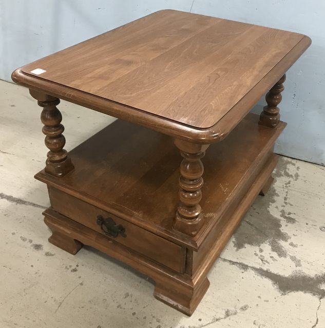 Ethan Allen Oak Lamp Table, Chippendale style, two tier, single drawer, exposed to mildew, 21"h., 20"w., 26"d. Ethan Allen Oak Lamp Table, Chippendale style, two tier, single drawer, exposed to mildew, 21"h., 20"w., 26"d.