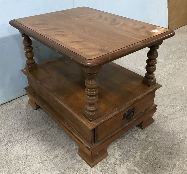 Ethan Allen Oak Lamp Table, Chippendale style, two tier, single drawer, exposed to mildew, 21"h., 20"w., 26"d. Ethan Allen Oak Lamp Table, Chippendale style, two tier, single drawer, exposed to mildew, 21"h., 20"w., 26"d.