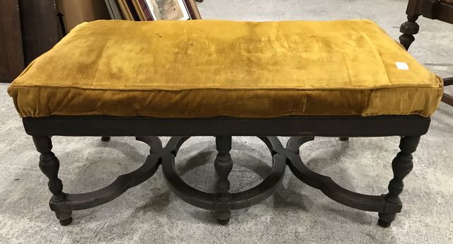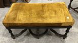 Vintage Wood and Upholstery Bench, exposed to mildew, has finish wear, 18"h., 39"w. Vintage Wood and Upholstery Bench, exposed to mildew, has finish wear, 18"h., 39"w.