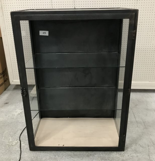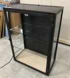 Black display cabinet, two glass shelves, door missing front glass, lighted, 30"h., 16"d., 42"h. Black display cabinet, two glass shelves, door missing front glass, lighted, 30"h., 16"d., 42"h.
