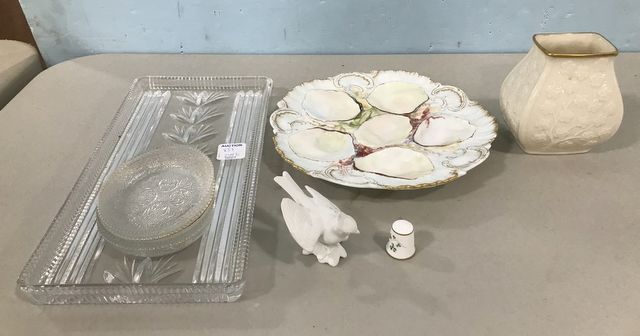 Porcelain hand painted egg tray, Lenox vase, clear glass tray and nut dishes, ceramic bird, thimble. Porcelain hand painted egg tray, Lenox vase, clear glass tray and nut dishes, ceramic bird, thimble.