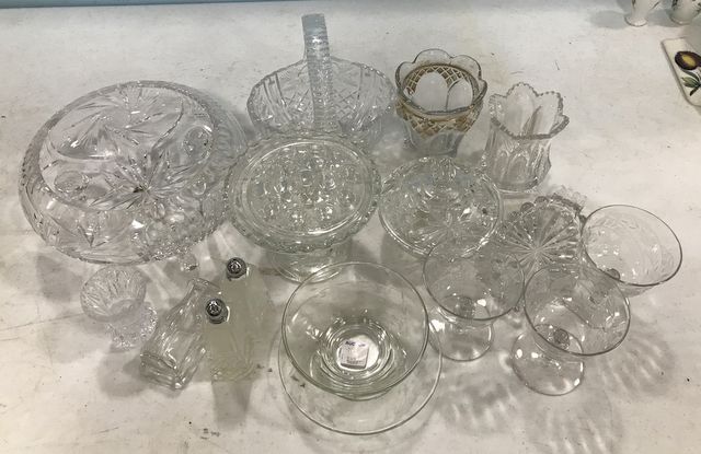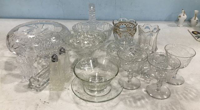 Etched footed bowl, pressed glass basket, etched glass stems, glass planters, salt & pepper, tooth pick holder, covered dish. Etched footed bowl, pressed glass basket, etched glass stems, glass planters, salt & pepper, tooth pick holder, covered dish.