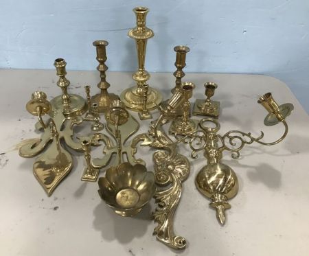 Group of brass decor, candle sticks, wall sconces, emblem, colonial style. Group of brass decor, candle sticks, wall sconces, emblem, colonial style.